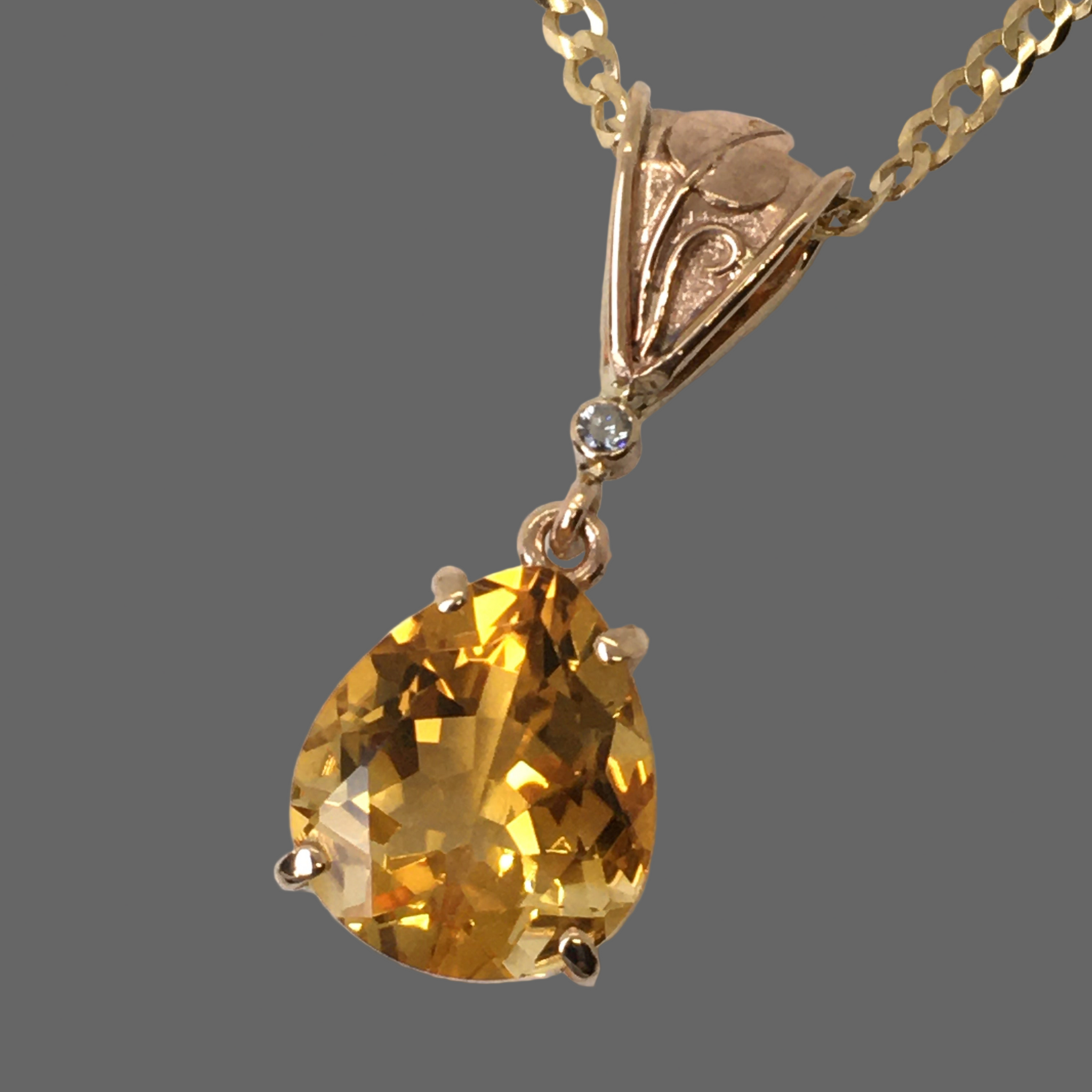 Does your heart glow naturally? Sometimes we need a little help in this department and here's a brilliant way to shine from your heart center. Citrine represents happiness and positivity, We are positive you will love this bright pear shape Citrine pendant. The brilliant orange/yellow Citrine hangs from a fancy bail that has a mat background with an ivy leaf overlay. Between the bail and the prong set gem is a recycled bezel set Diamond.