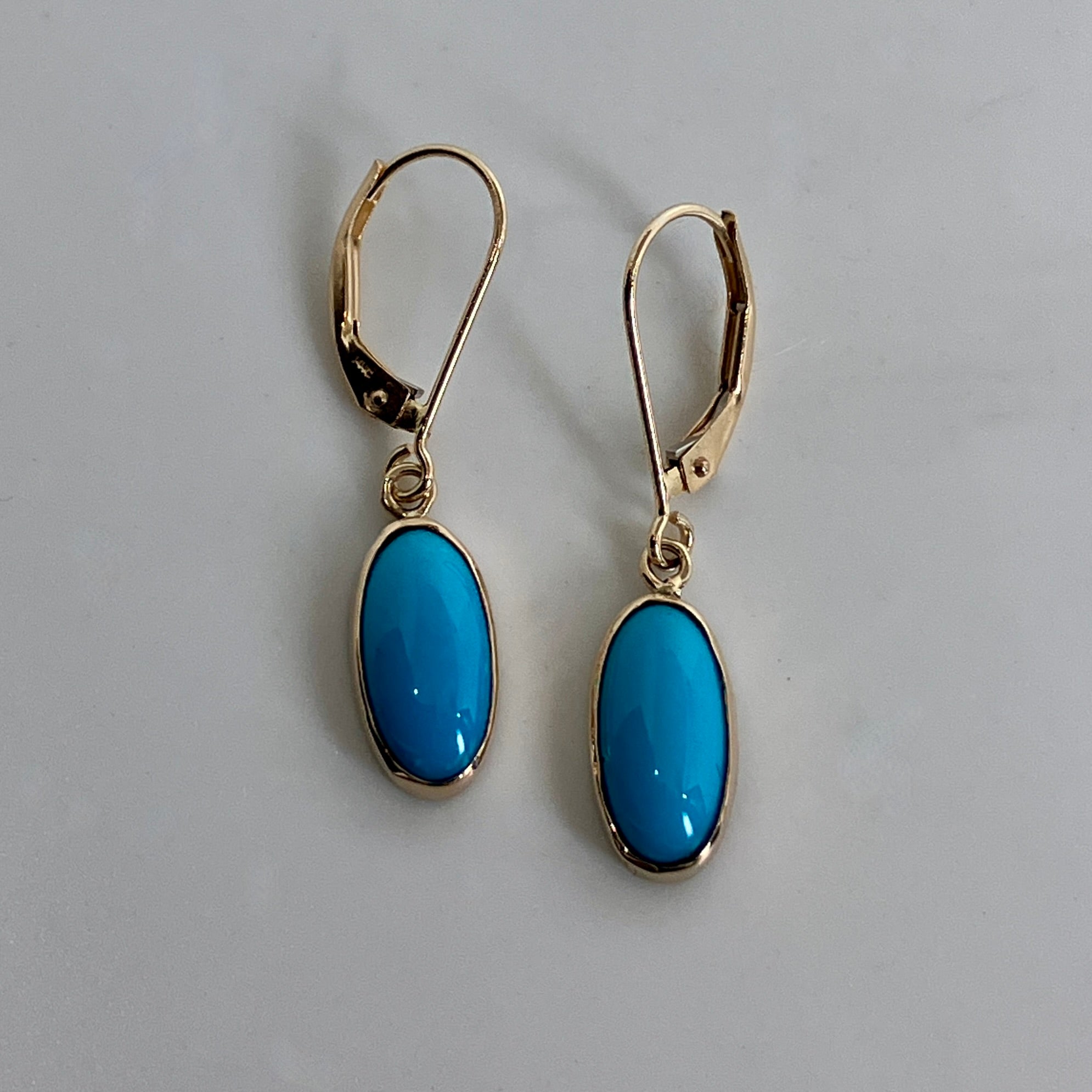 Simple and delicate earrings to wear all the time. America's own Sleeping Beauty Turquoise doesn't need any embellishment, the color does it all by itself. These bezel set oval Turquoise earrings dangle and swing easily from lever backs. Discount available if purchased as a set with matching pendant.