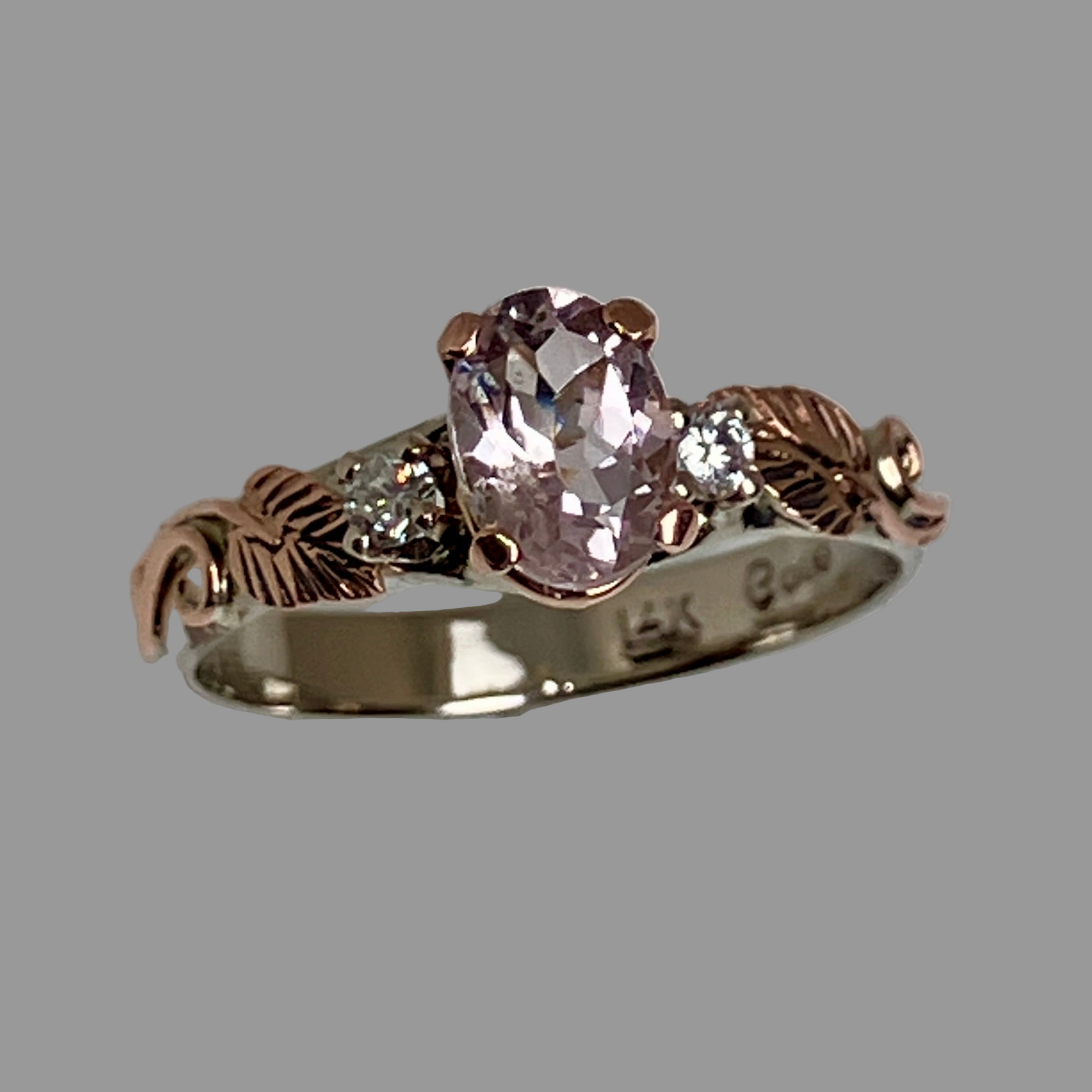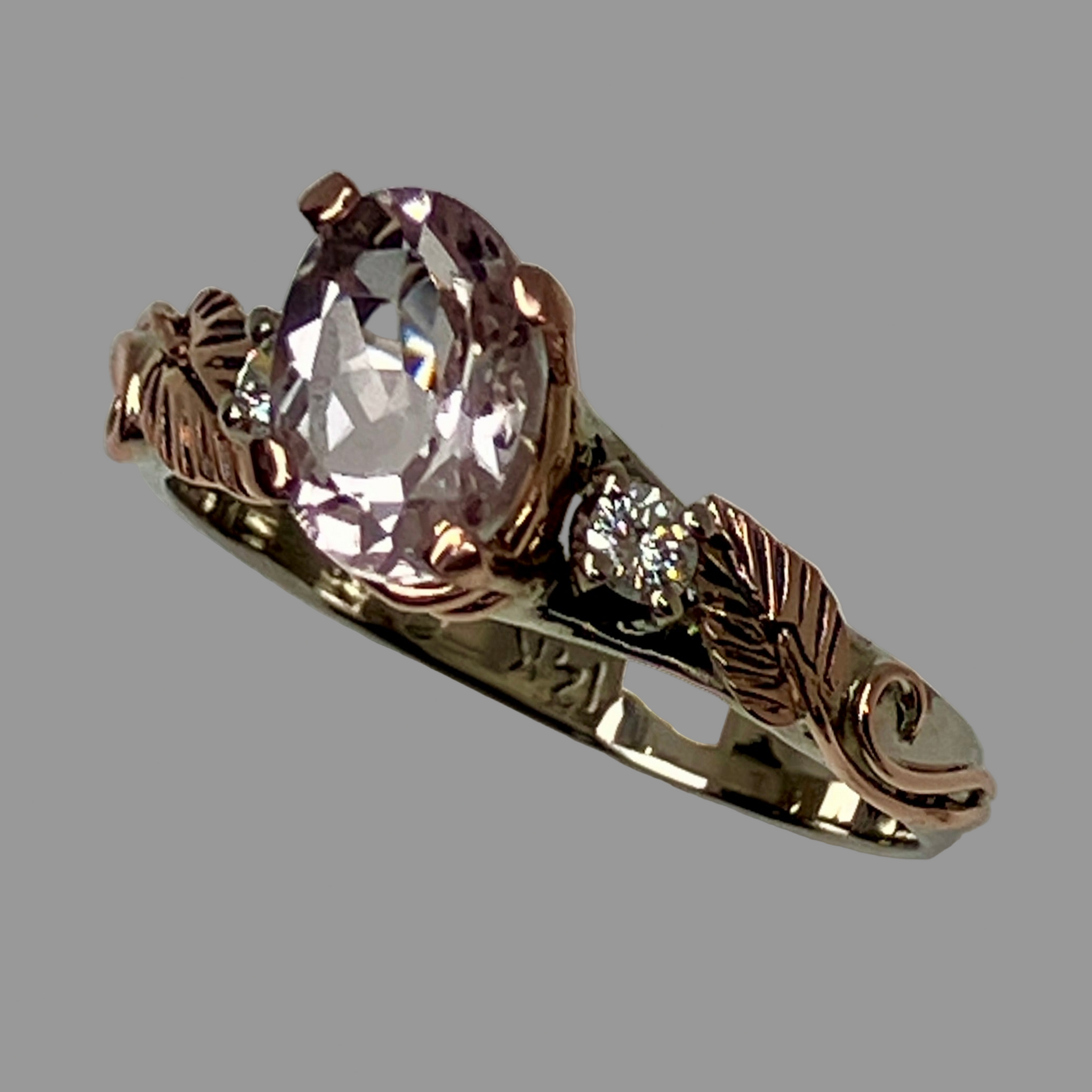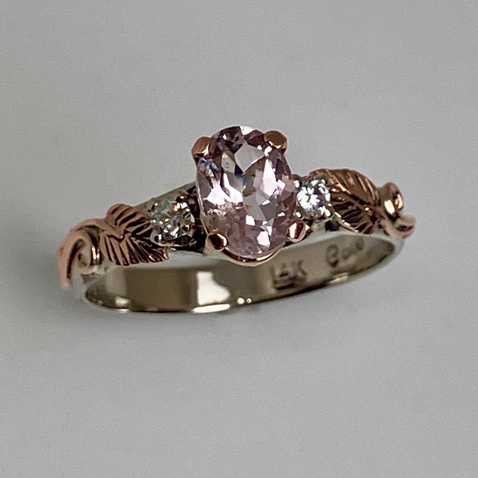If you want a Morganite ring with a twist, this one’s for you! Morganite, the pink cousin of Aquamarine and Emerald, offers a charming and gentle pop of color that’s built to last. Scoring 7.5 to 8 on the Mohs scale, it’s tough enough for everyday sparkle—any scratches? No worries, a gem pro can polish those right out. This two-tone beauty mixes 14K rose and white gold, featuring twinkling upcycled Diamonds on each side. Rose gold leaves and vines cradle the stones, blending elegance with a fresh, modern vibe. Classic, yet full of surprises!