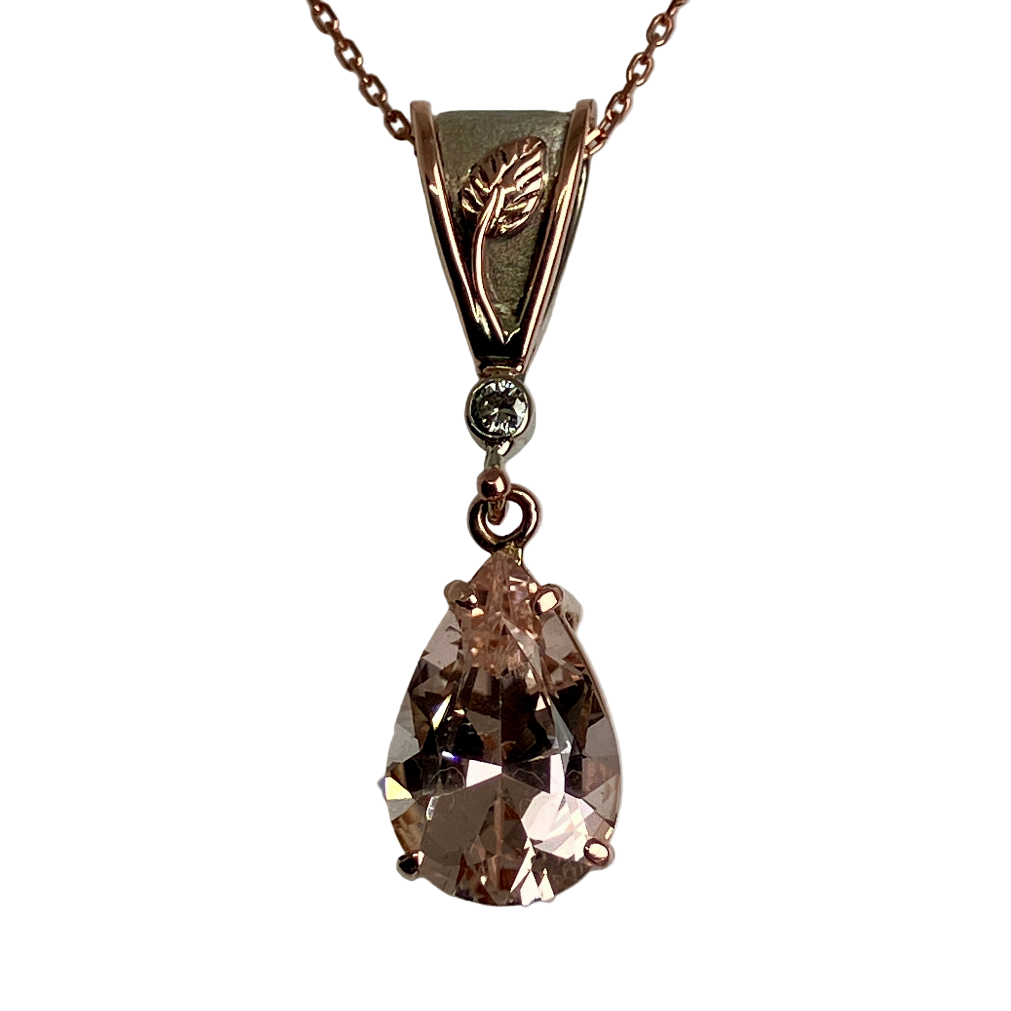This faceted pale pink Morganite is stunning. Set in a 14K rose gold prong setting, the large pear shaped gem swings below a bezel set Diamond. The upcycled Diamond is at the bottom of a hand fabricated bail that has a rose gold leaf and vine resting on a brush finish white gold background. The pendant slides on a rose gold square cable chain with a lobster claw clasp.