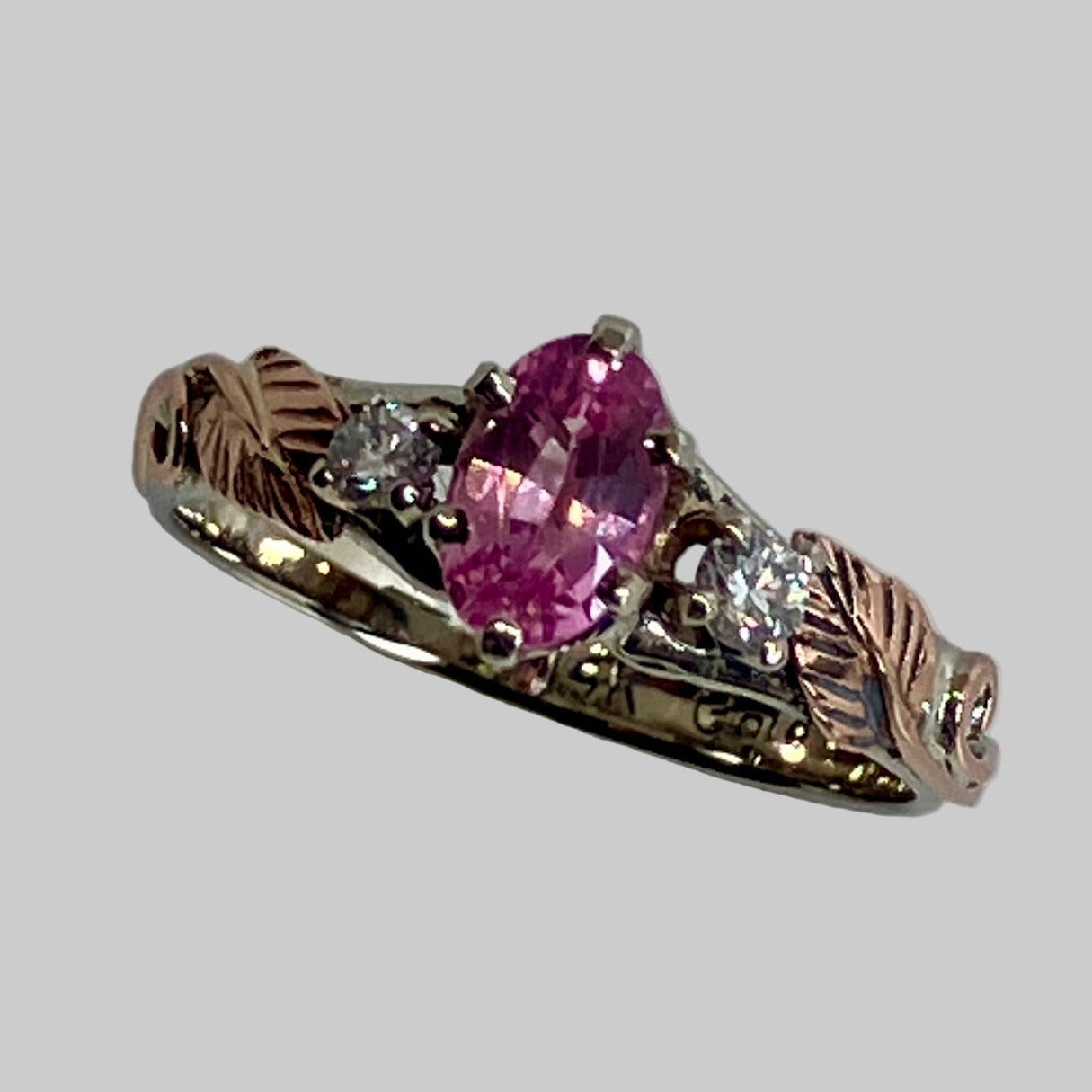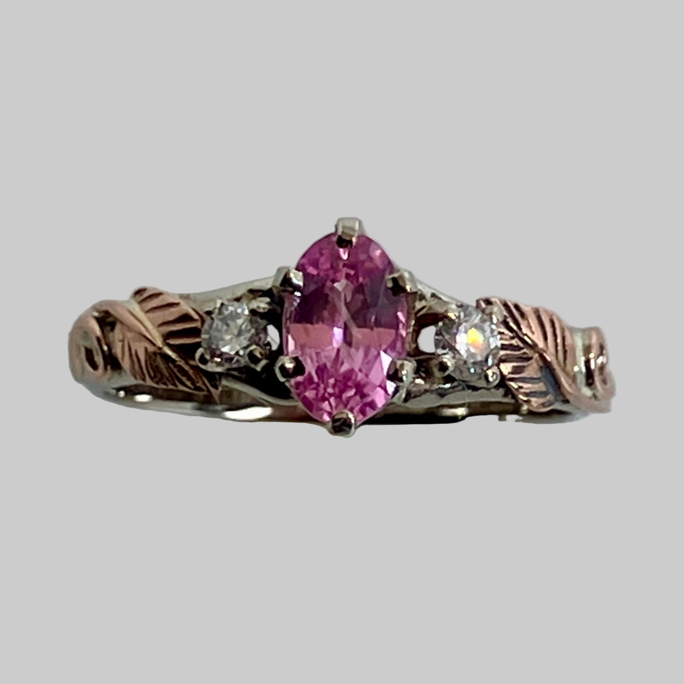 Padparadscha Sapphires are the most valued Sapphires in the world. The color is so unique that it's hard to imitate with dyes and paints. This oval gem is a beautiful sparkly pink/peachy color set in 6 sturdy 14K white gold prongs. On either side of the Sapphire is a prong set recycled Diamond, and a hand stamped 14K rose gold leaf and swirly vine. The narrow band is made in 14K white gold.