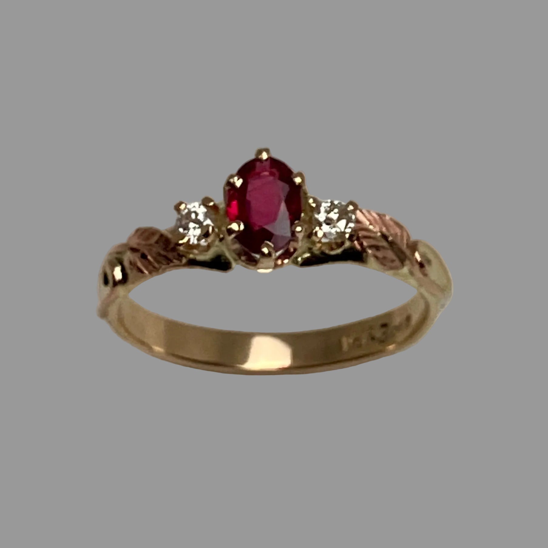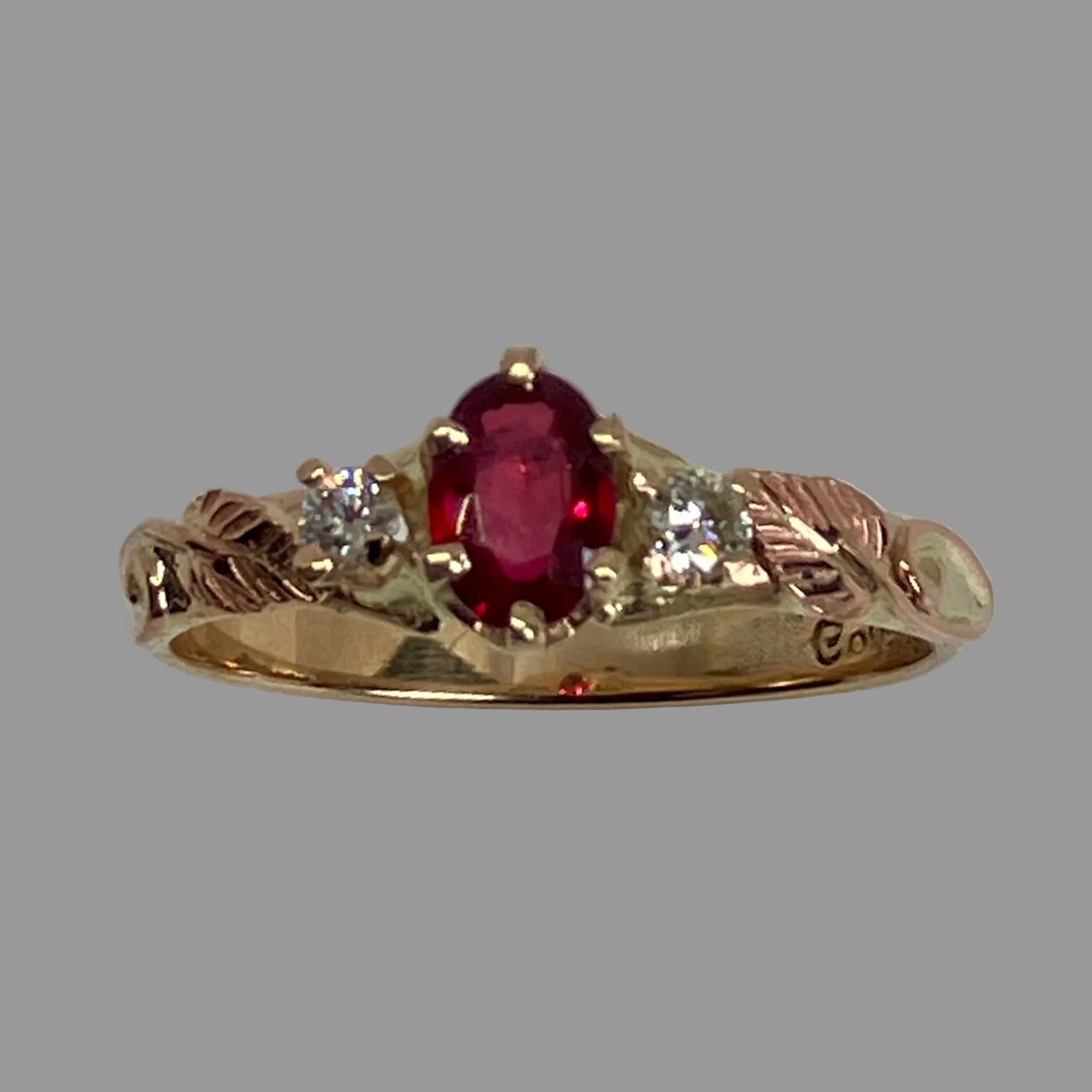 This is a lovely Ruby ring for people who like small but important jewelry. The oval Ruby is deep red in color and set in 6 sturdy prongs. On either side of the Ruby is a recycled Diamond, and a hand stamped leaf and swirly vine in rose gold. The narrow band is made in 14K yellow gold.